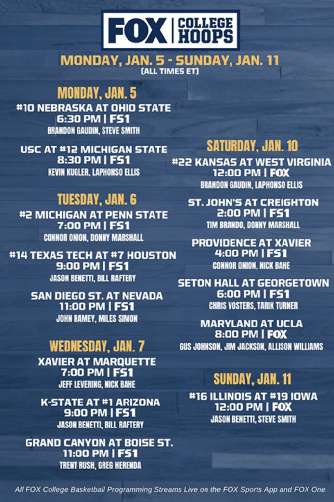 FOX COLLEGE HOOPS Jan. 5-11 Schedule and Broadcast Assignments