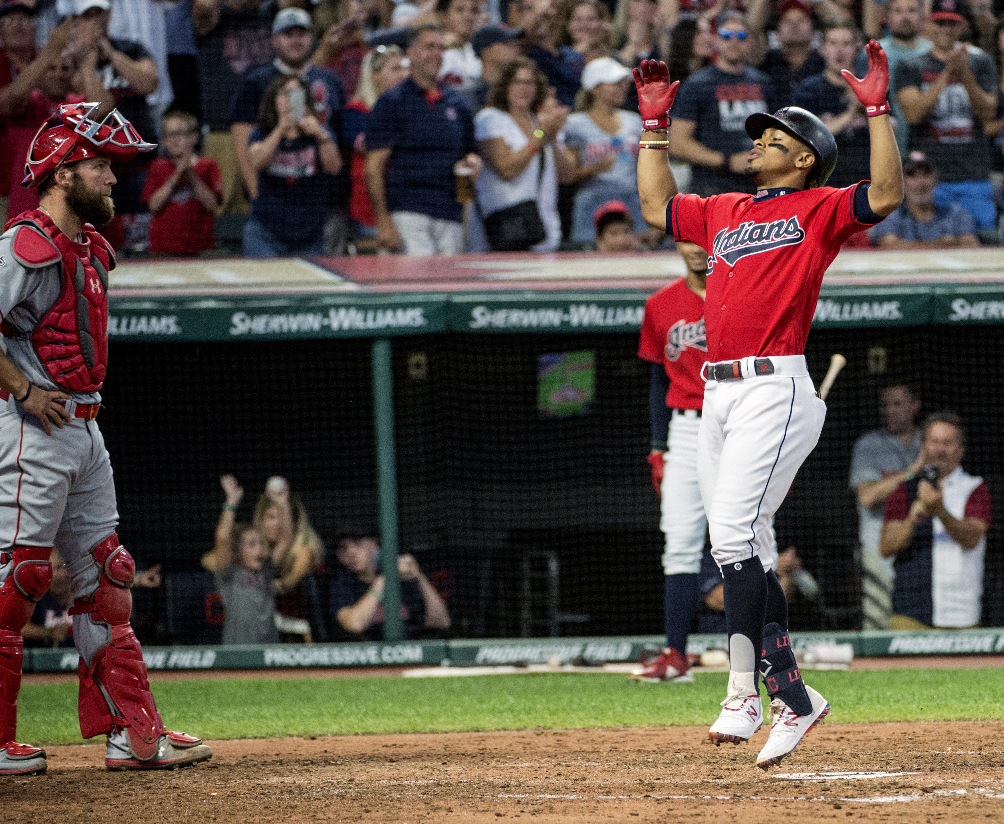 Cleveland's rally came moments after Browns quarterback Baker Mayfield was shown on the scoreboard, sitting in a Progressive Field suite. Mayfield drank from a beer can after biting into it and showed off his Lindor jersey, leading to a loud cheer from the crowd.
