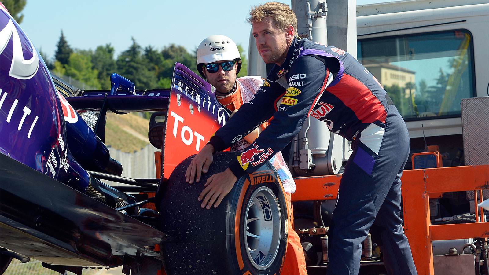 MONTMELO, Spain -- Sebastian Vettel's day ended with the four-time defending Formula One champion hitching a ride on a scooter after his Red Bull puttered out.