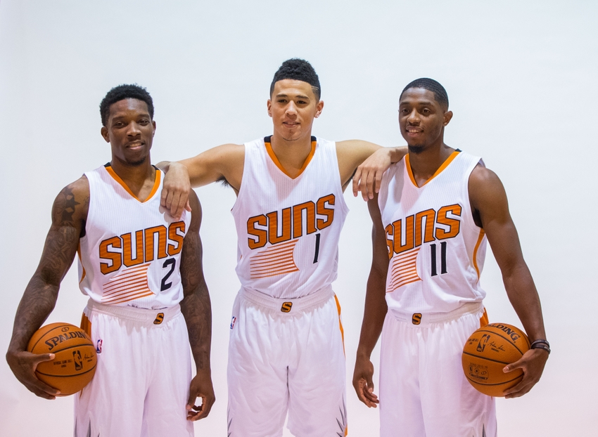 Sep 26, 2016; Phoenix, AZ, USA; (From left) Phoenix Suns guard Eric Bledsoe , guard Devin Booker and guard Brandon Knight. Credit: Mark J. Rebilas-USA TODAY Sports