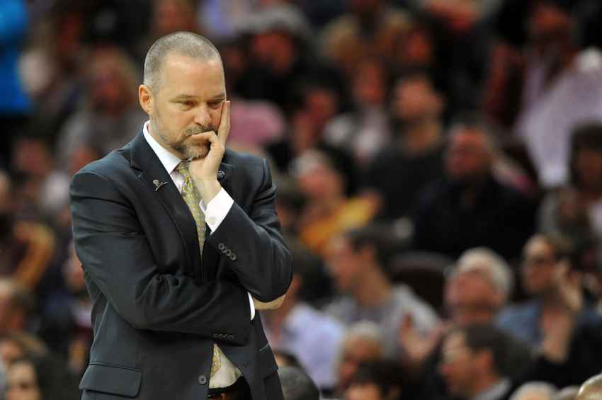 Mar 21, 2016; Cleveland, OH, USA; Denver Nuggets head coach Michael Malone reacts during the fourth quarter against the Cleveland Cavaliers at Quicken Loans Arena. The Cavs won 124-91. Mandatory Credit: Ken Blaze-USA TODAY Sports