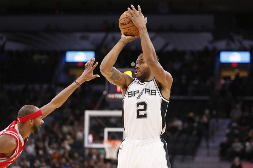 Oct 14, 2016; San Antonio, TX, USA; San Antonio Spurs small forward Kawhi Leonard (2) looks on during the first half against the Miami Heat at AT&T Center. Mandatory Credit: Soobum Im-USA TODAY Sports
