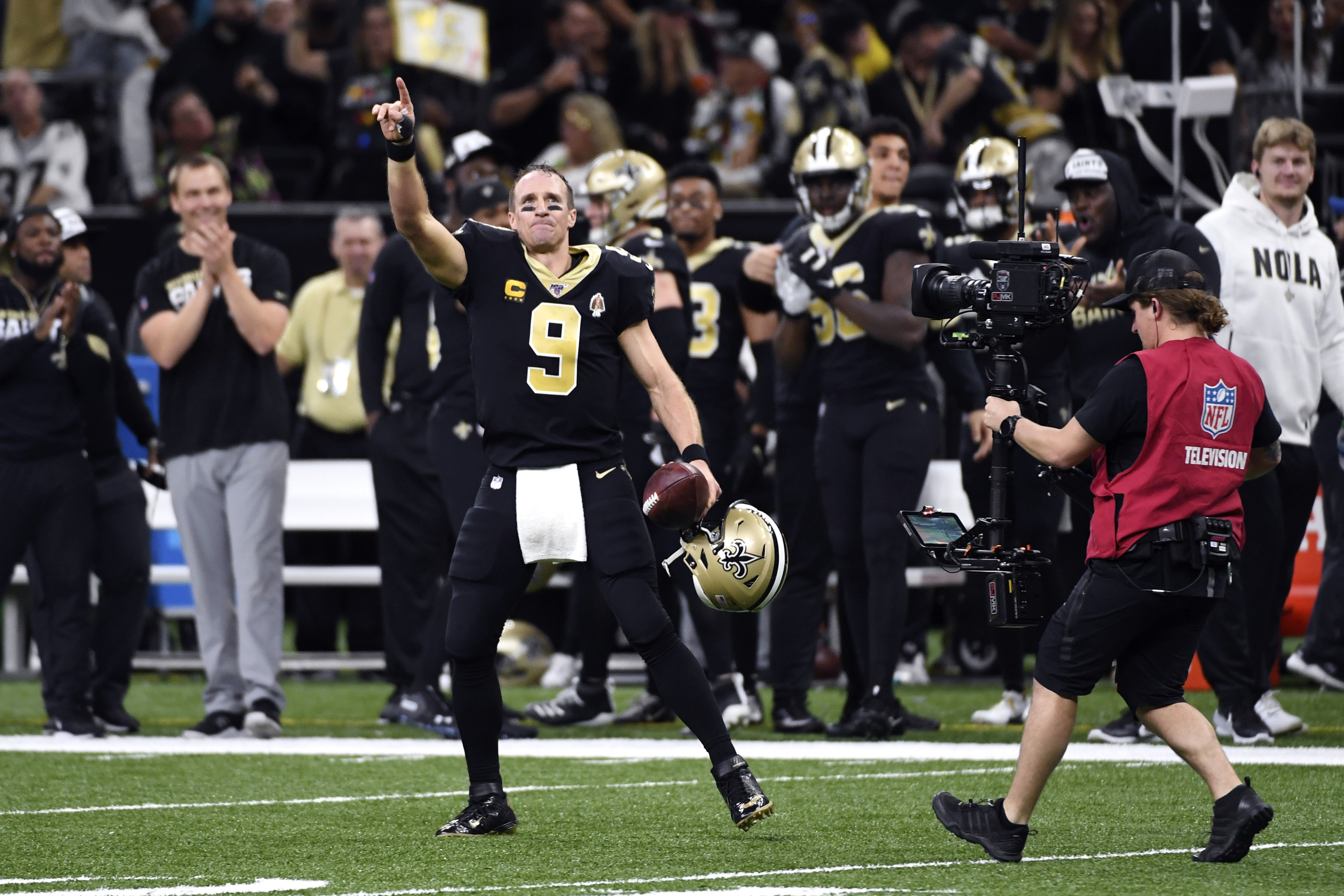 NEW ORLEANS (AP) — Drew Brees trotted along the sideline holding his helmet and a Hall of Fame-bound ball in his left hand while using his right hand to wave and blow kisses to an adoring Superdome crowd.