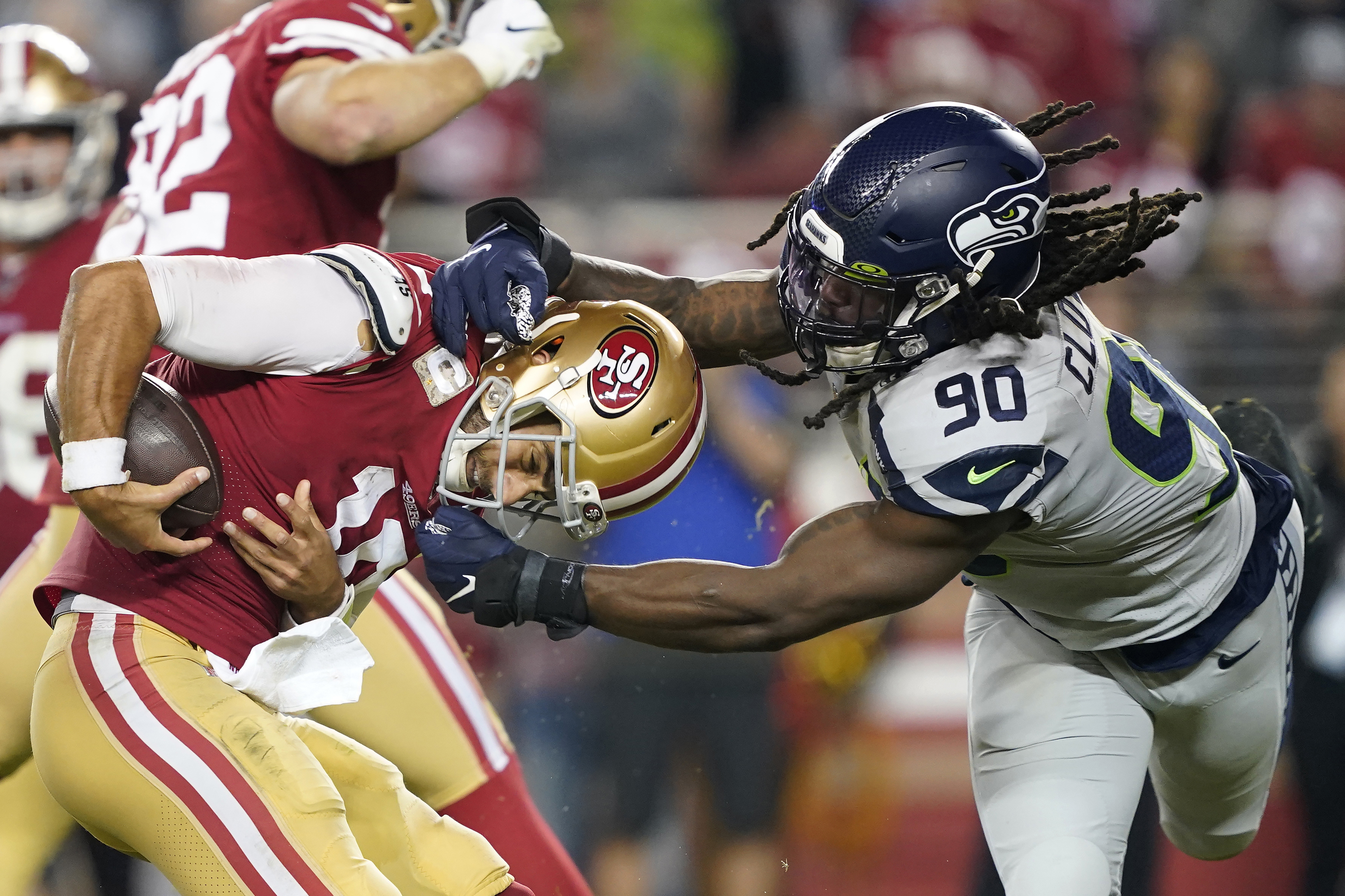 “He had so many impact plays. Such a significant role in the night,” coach Pete Carroll said. “I think he affected the guys around him, most obviously, in terms of our pass rush, pressure on the QB, and just the activity. This was his best game. It’s looked like he should have numbers and stuff like that in what we’ve seen. We have not been disappointed at all in his activity, his effort, and all that.”