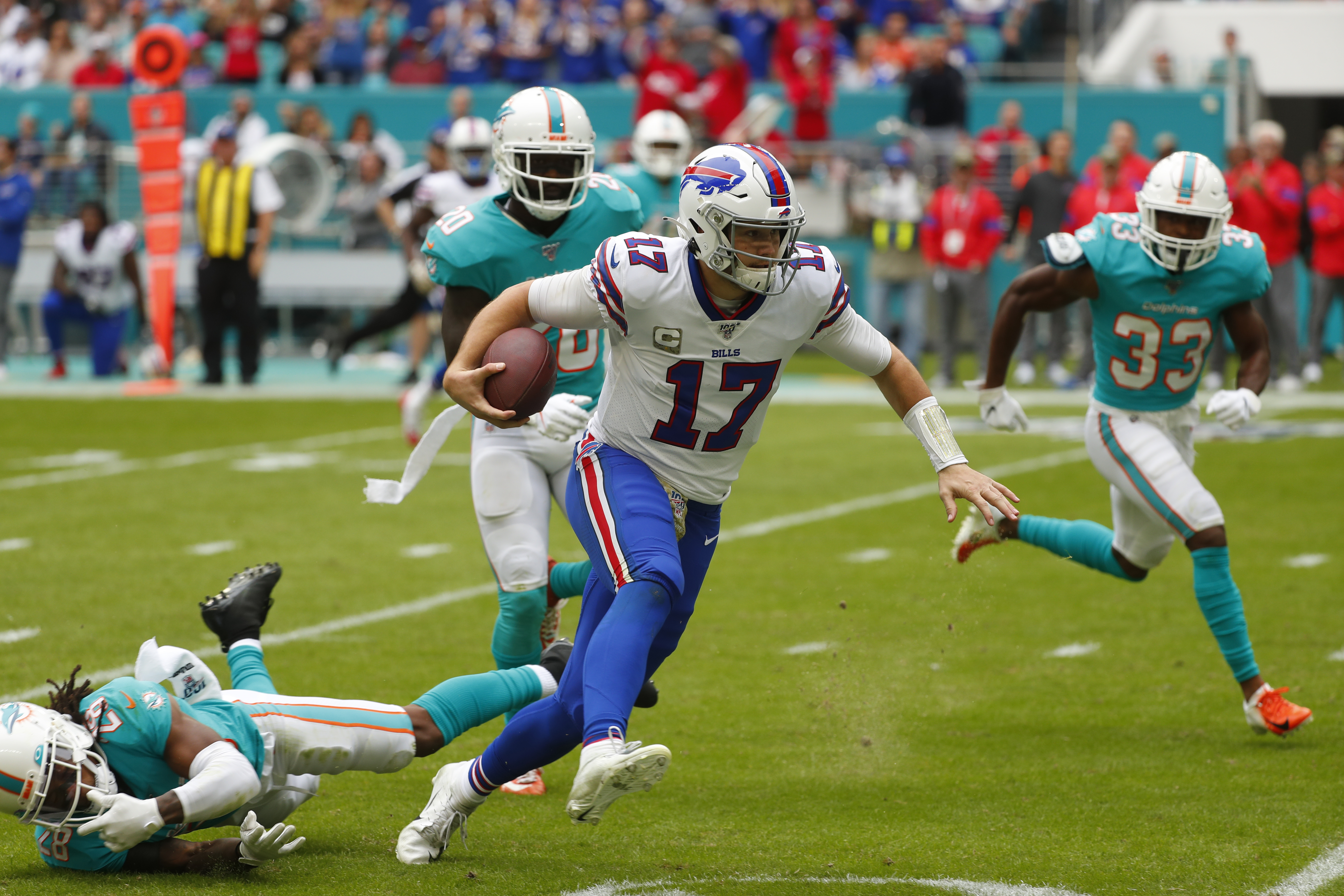 Miami couldn’t keep up against Buffalo’s smothering front. The Bills totaled a season-high seven sacks and allowed only 23 yards rushing.