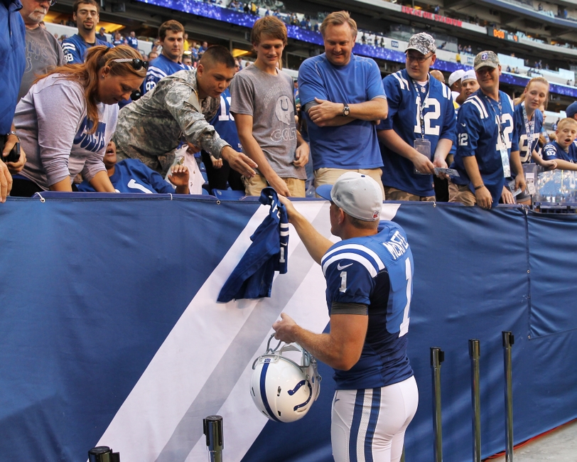Oct 16, 2016; Houston, TX, USA; Indianapolis Colts punter Pat McAfee (1) on the sidelines against the Houston Texans during the fourth quarter at NRG Stadium. Mandatory Credit: Erik Williams-USA TODAY Sports