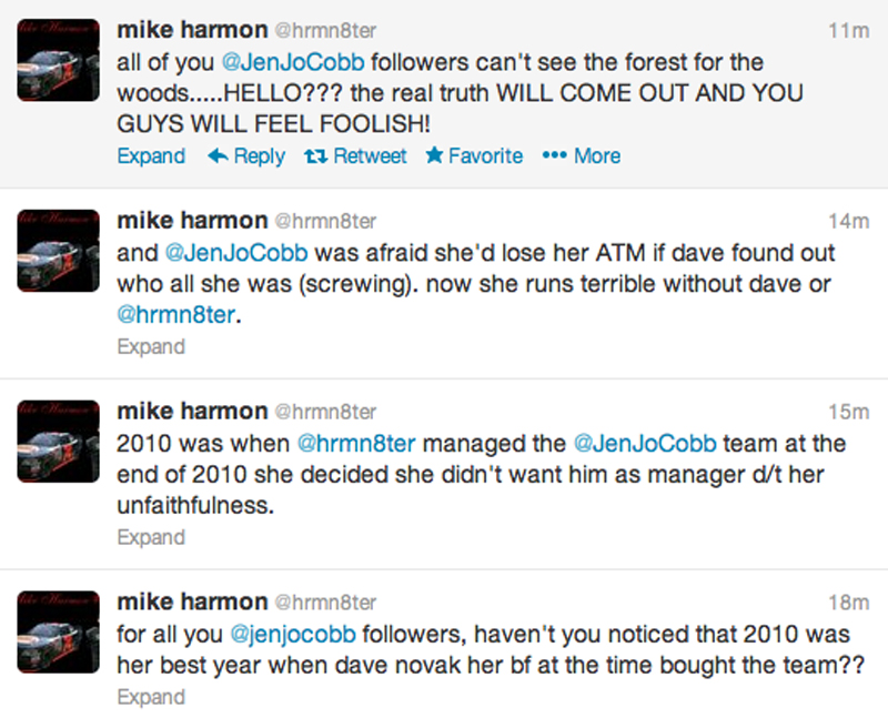 But when a series of harsh and very personal Tweets about Cobb appeared on Harmon’s account Friday night, Harmon quickly deleted them and claimed his account had been hacked.