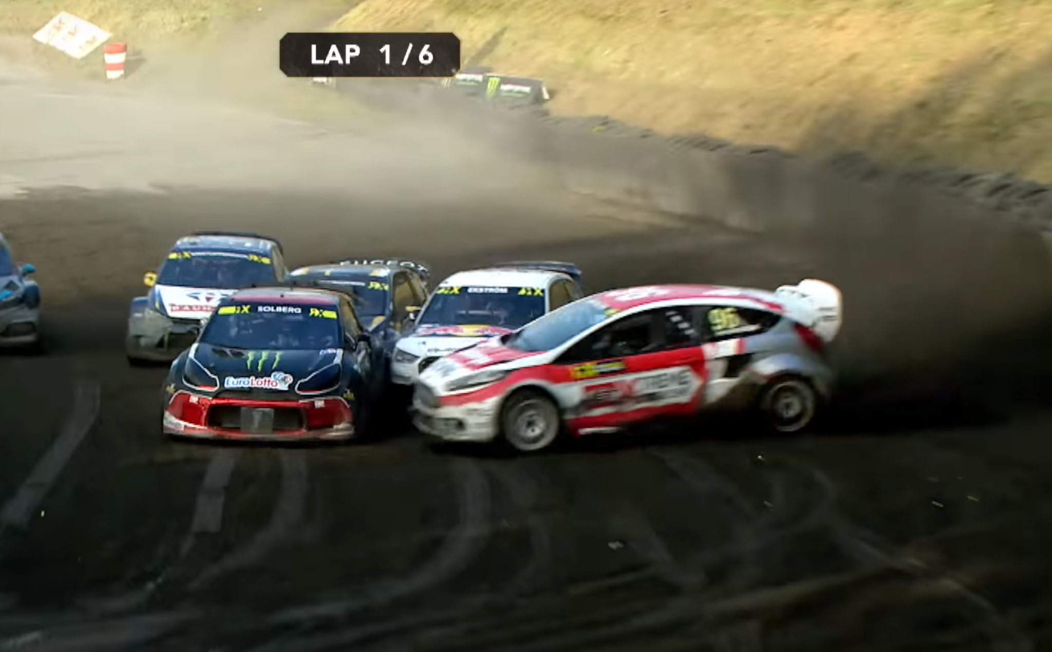 Swedish Rallycross driver Kevin Eriksson made one of the wildest moves you'll ever see to overtake two cars in the first corner Sunday in Germany. Here's where Eriksson was entering the braking zone.