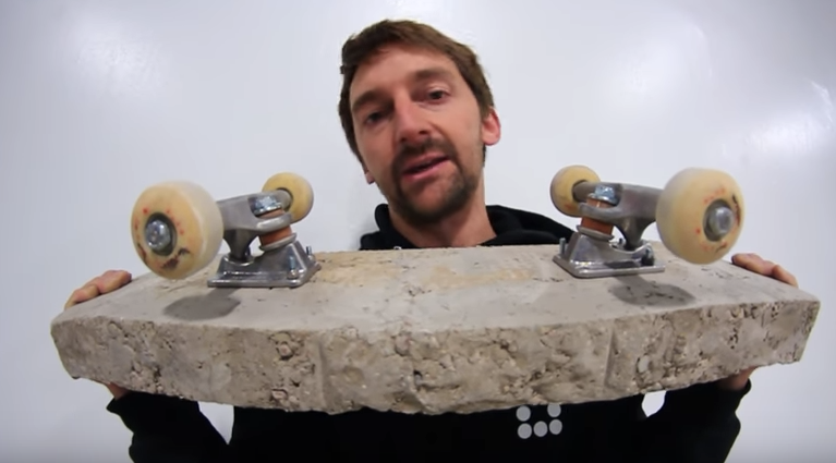 Watch a guy riding a skateboard made of solid concrete
